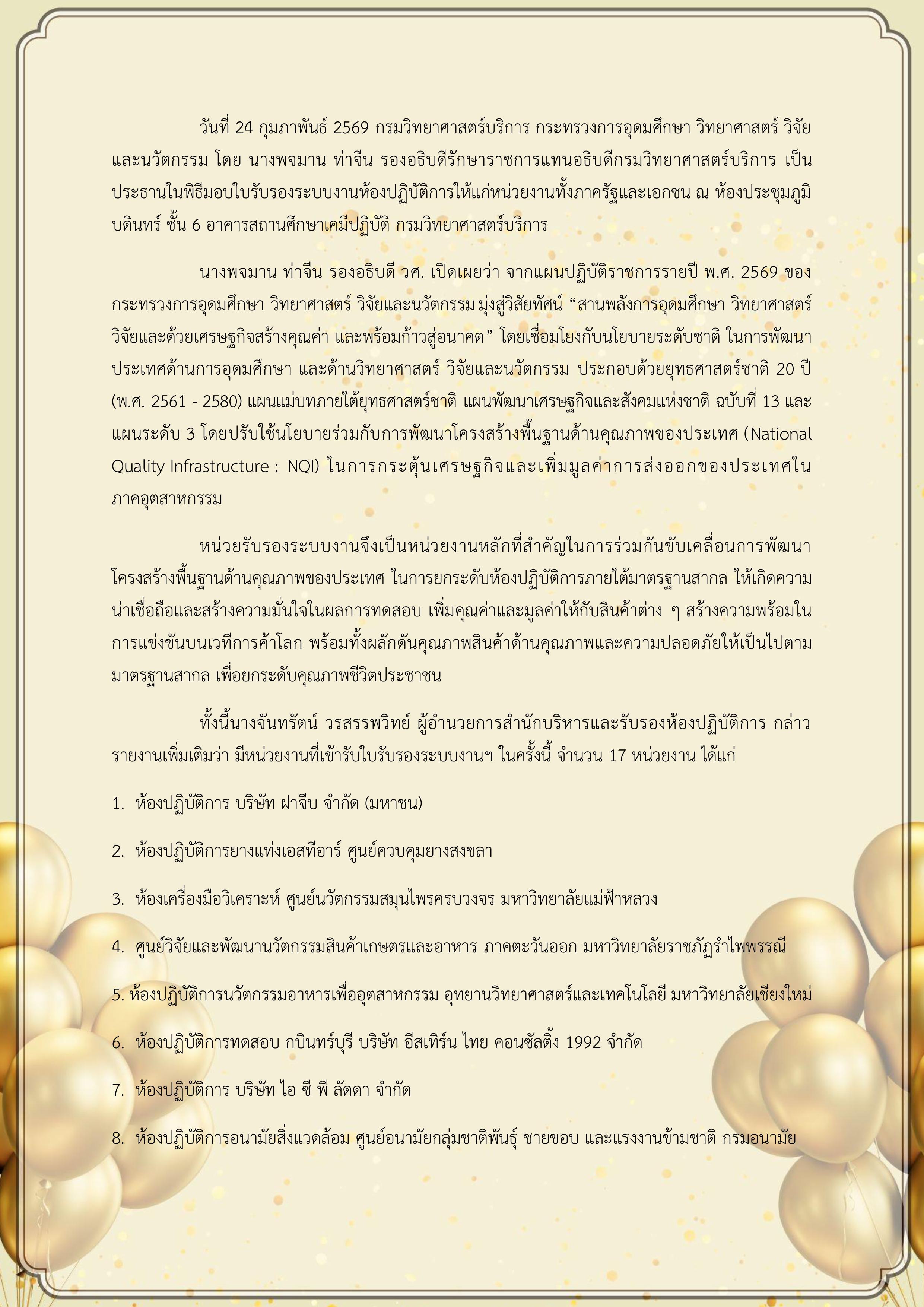 พิธีมอบหนังสือรับรองห้องปฏิบัติการทดสอบ วันที่ 24 กุมภาพันธ์ 2569